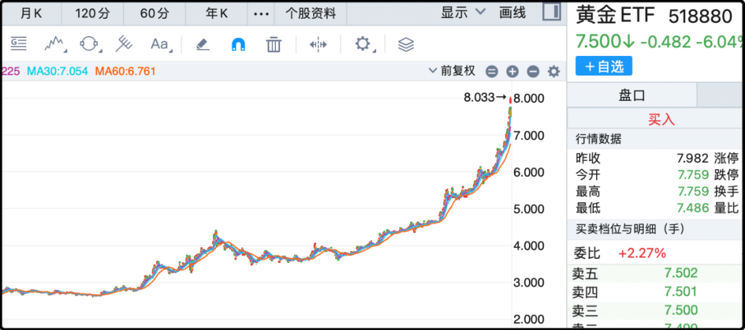 在昨天短暂冲至3500之后,黄金终于跌了,最新金价是3340,回撤了5%左右。受此影响a股的黄金板块下跌7.5%,是今天两市跌幅最多的板块。
