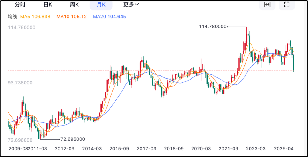 这种避险式的大宗商品行情,要看美元这一轮会贬到哪,很多人对美元指数目前的位置没有概念,我贴一个自2009年以来的月k线,应该说还是处于一个相对偏高的位置。目前是98.6,可能会在93-96区间平台找到支撑。