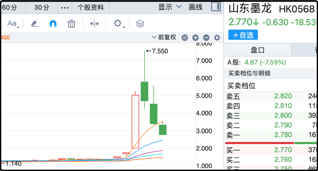 最后提一嘴昨晚讲的那个山东墨龙,a股摘帽涨停,港股没有涨停限制直接涨200%,结果大股东们一口气卖了13%的股份,卖舒服了。周三股价最高冲到7块多,现在只剩2块7了。这倒是一个案例,说明了涨跌停板可以在一定程度上抑制投机,不然就a股散户那好赌的性子亏钱速度会更快。