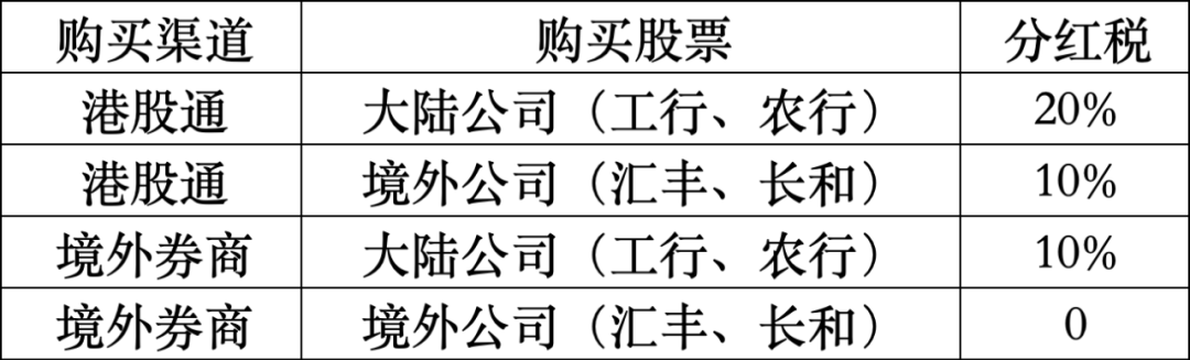 但你需要注意用港股通买港股里的大陆股票,分红要扣20%的税,这个我做个表格你们一看就懂了: