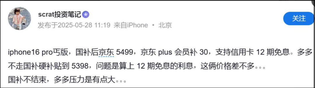 你们还记得我之前说有读者开个体商店卖家电,诉苦快被国补搞倒闭了,因为客源都去大平台参与国补,小店生意流失严重。以小店家为主的拼多多商户也面临类似的问题,现在是平台给小店家输血在硬扛。我转发一个下午在雪球看到的帖子: