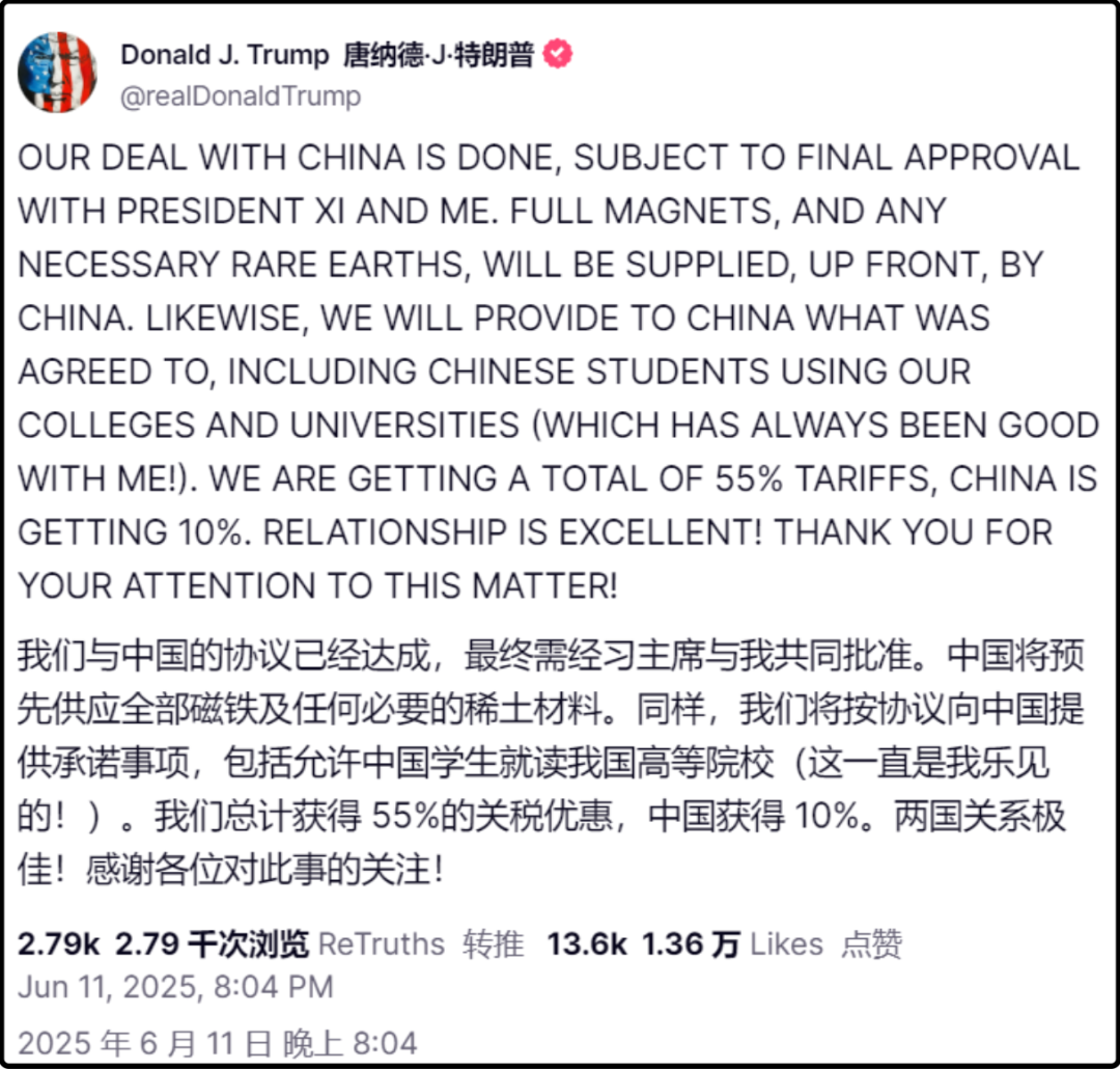 另外中国供应磁铁和稀土,美国允许中国留学生继续就读美国高校,据说还包含了芯片EDA、部分工业配件的出口,但这个没写在帖子里。