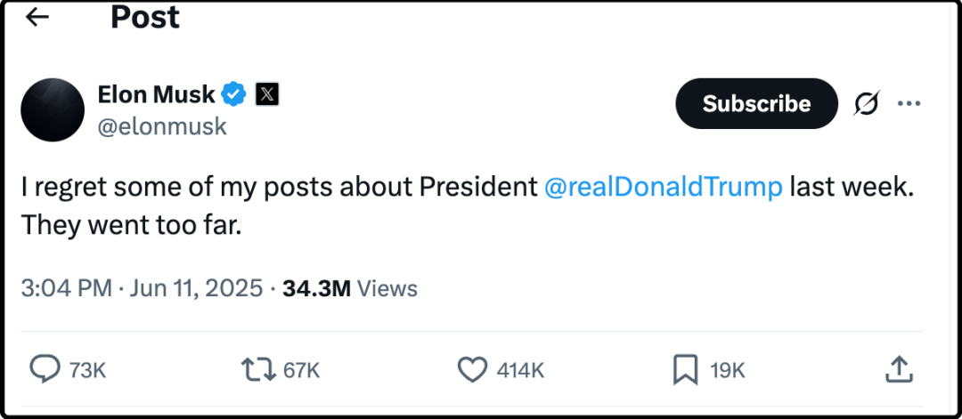 3、美国时间半夜3点的时候,马斯克突然发帖说后悔前几天说的那些攻击特朗普的话,自己做的过分了。我下午看到截图的时候还以为是假的,让美国朋友帮忙确认真的是他发的帖子,没想到他这种社交暴君会公开道歉,太阳从西边上来了。